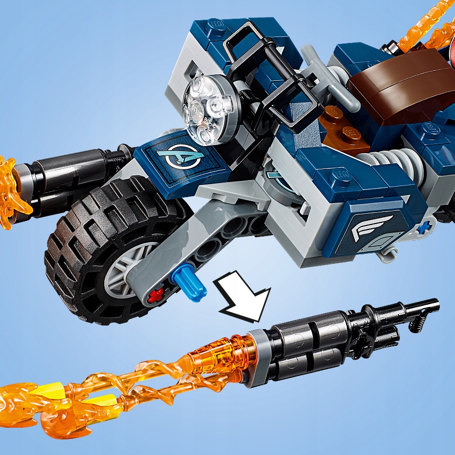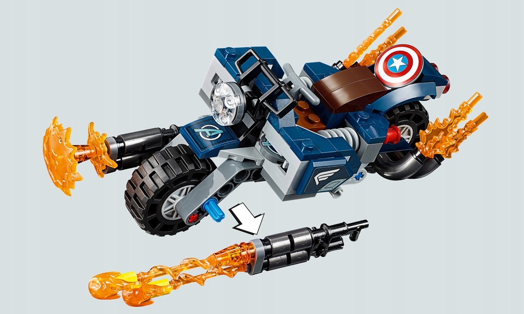 Motocykl kapitana ameryki ma siedzenie dla minifigurki, dwa miotacze tarczy kapitana ameryki, przednie ten zestaw z superbohaterem zawiera minifigurkę kapitana ameryki z nowym hełmem kapitan ameryka. Poniżej możesz bezpłatnie obejrzeć i pobrać instrukcję budowania w formacie pdf.